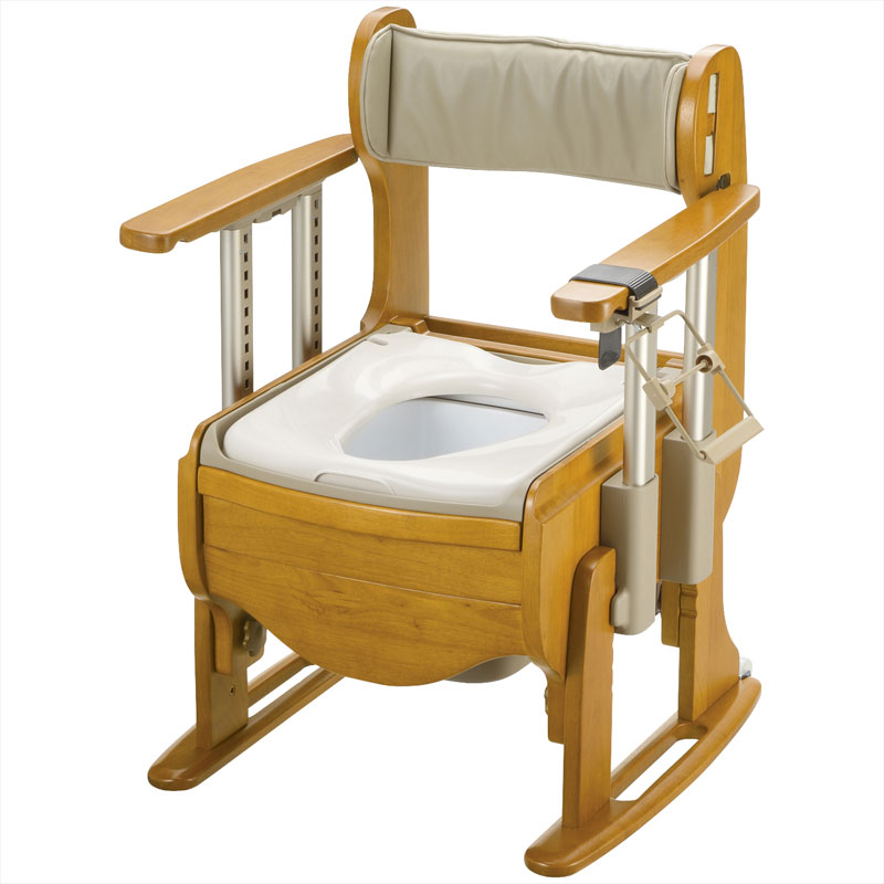 - 本体部:天然木(ラバーウッド)ポリウレタン塗装、肘掛け:天然木(ラバーウッド)ポリウレタン塗装・アルミ、座面・背もたれ:合成皮革・ウレタンフォーム、やわらか便座芯板・バケツ:ポリプロピレン、やわらか便座:EVA樹脂・ポリプロピレン