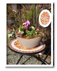 細長いプランターなので、可愛いミニ葉牡丹を真ん中に斜めに配置しその両側に黄色オレンジ系で明るく仕上げました。