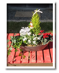 季節の植物と、これから気温が下がる天候も意識した感じの植物の組み合わせで、花がなくとも力強さや華やかさ、春を待つウキウキした気持ちなど、様々な気持ちが引き出されます。 器の形状と、草姿のバランスがとても良く考えられている作品だと思います。 季節の「らしさ」が詰まったような作品です。土を見せず、マルチングで仕上げた点もぴったりだと思います。