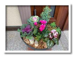 植物の色使い及び、置き場所と器の組み合わせがとてもよくまとまっています。 白い台を使ったことがアクセントにもなっています。 葉ボタンの流れるような配置と、ラインの葉物を程よく配置したところが、根の扱いの丁寧さと、見せ所を理解しているように感じます。 それぞれの植物の草姿が生き生きと寒い季節を楽しんでいるような植物の力強さが感じられる良い作品です。