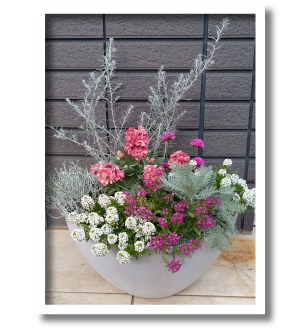 右側の葉ボタンからアリッサムの流れがとても美しい作品です。 器の色・形状と、器の重量感に負けない植物選びが出来ていますので、 細部まで全体が見えるようにしたら、今以上に素敵になると思いますよ。
